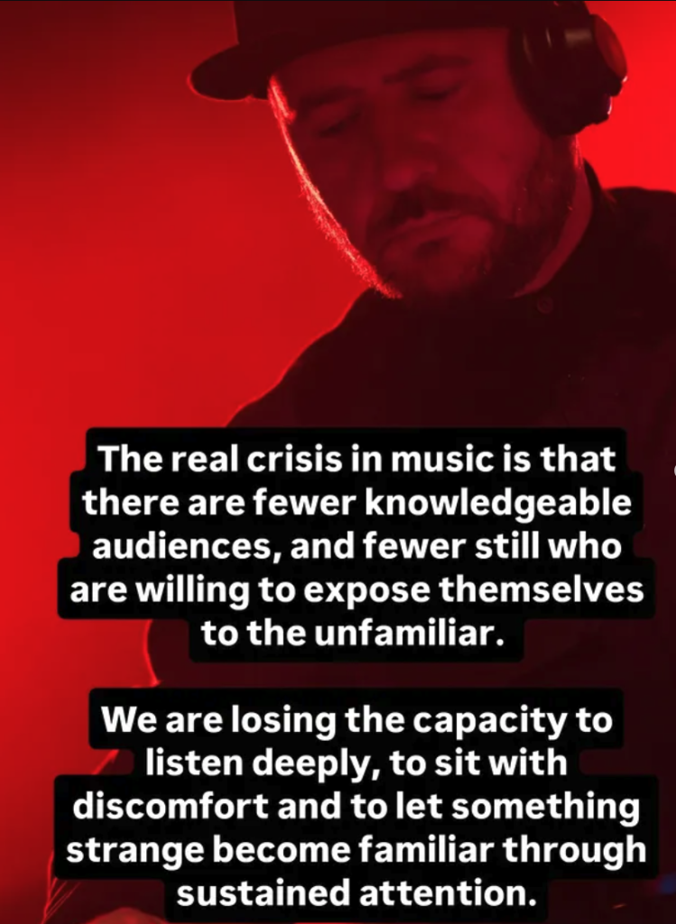 ch wollte sowieso was zu diesem Thema schreiben, aber den Anstoß jetzt gab mir das Posting von Michail Stangl, aka Opium Hum, wobei ich bei Slide 1 noch völlig mitgehe, bei den anderen aber nur zum Teil, aber da hat er nunmal einen Punkt, der mir über die Jahre und speziell nach dem Coronabruch aufgefallen ist. Was heute innerhalb eines Sets gespielt werden kann hat sich extrem verengt und das liegt nicht nur an der Kürze der heutigen Sets, sondern auch an der Erwartungshaltung, womit ich auch wieder auf die veränderten Parameter zurückkommen muß. Wer heute ausgeht will für sein Geld eine Guterabendgarantie, was bei Preisen zwischen 15 und 25 Euro für den Eintritt auch verständlich ist, während man früher etwas zwischen 5 und 15 Euro zahlte und bei Bedarf eben die Location wechselte. Das führt dann dazu, das das Geschichte erzählen mittels Set eher in den Hintergrund tritt, man erwartet nicht mehr das Unerwartete, sondern das Erwartete. Während die Leute früher an der Tür noch gefragt werden mussten ob sie denn wissen wer da heute spielt um überhaupt reingelassen zu werden, ist das heute eigentlich kaum noch nötig, man geht eh nur zu dem was man kennt und der DJ hat dann die Aufgabe in anderthalb bis 2 Stunden das zu spielen was man von ihm erwartet, ein unrisky Set (in Anlehnung an Westbam’s Begriff „The Risky Sets“). Ich weiß jetzt nicht ob das in allen Genres gerade so stattfindet, aber in Techno ist das schon sehr auffällig und lässt sich auch auf Ebene der Produktionen beobachten, die sich auch sehr eng in den einzelnen Korsetts bewegen. Michail schreibt dazu sehr passend “ We have infinite access yet choose finite comfort“ und ich denke Komfort ist dafür ein sehr passender Begriff, es geht nicht mehr um Entdecken oder die Überraschung, was, wie oben beschrieben eben auch nicht überraschend ist und ich befürchte auch, das je älter und tradierter so ein Ding wie Techno ist, sich solche Konservatismen automatisch einschleichen. Die Älteren wollen das was sie kennen und die Jüngeren auch, nur anders, weil sie nichts anderes kennen. Clubs müssen aufgrund der, nicht nur finanziellen, Gegebenheiten entsprechend darauf reagieren und schon haben wir den Teufelskreis, der sich aber schon lange absehen lies.